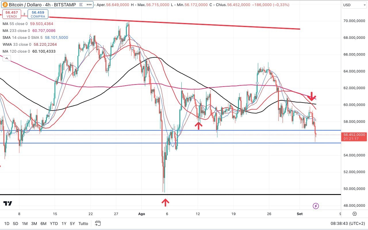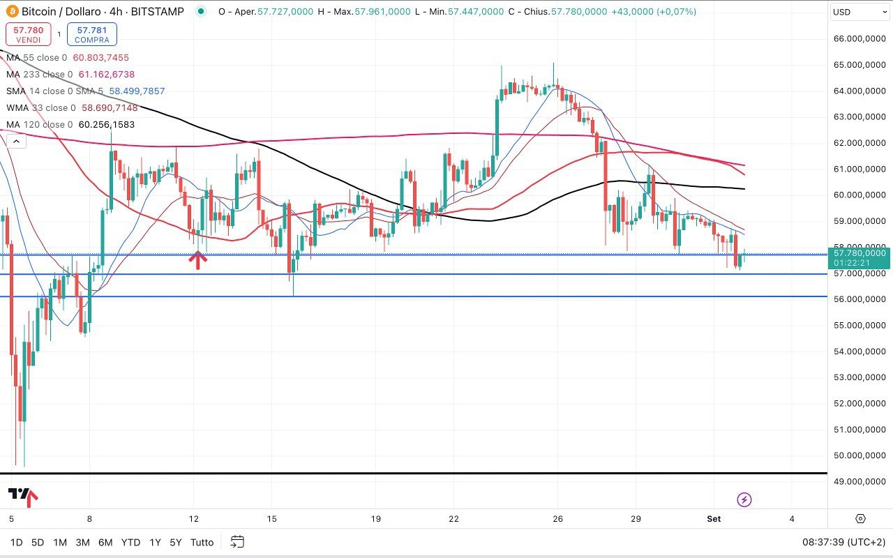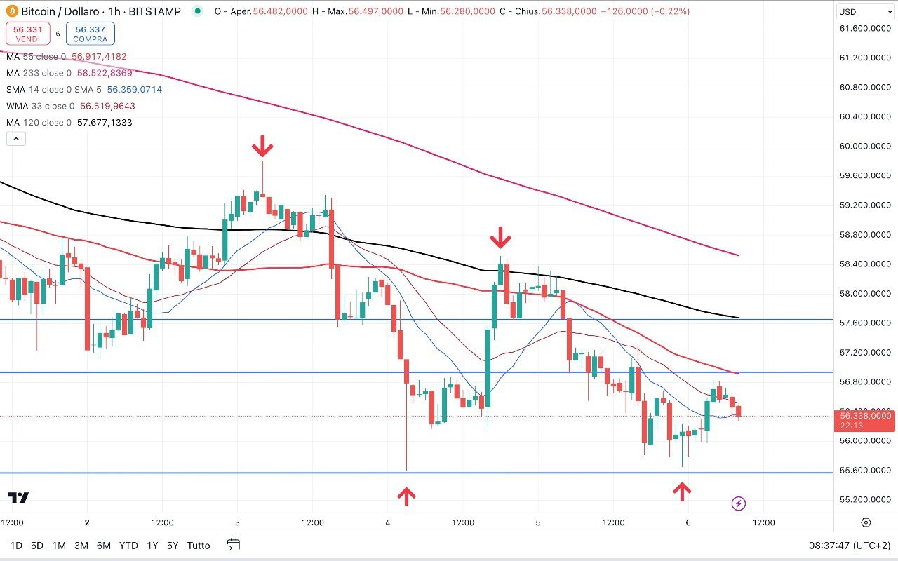 Ci troviamo ora attorno a 56500 dollari, con un minimo di breve fatto sotto i 56000 dollari.
