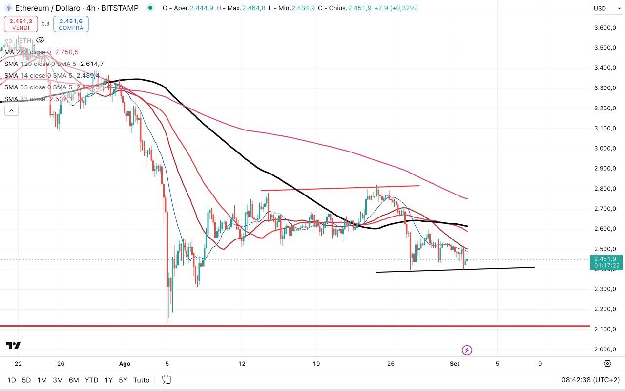 Andamento simile su ETHEREUM, che è sceso dai 2800 agli attuali 2450 dollari.