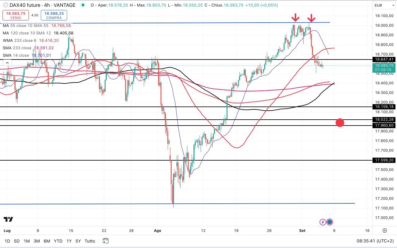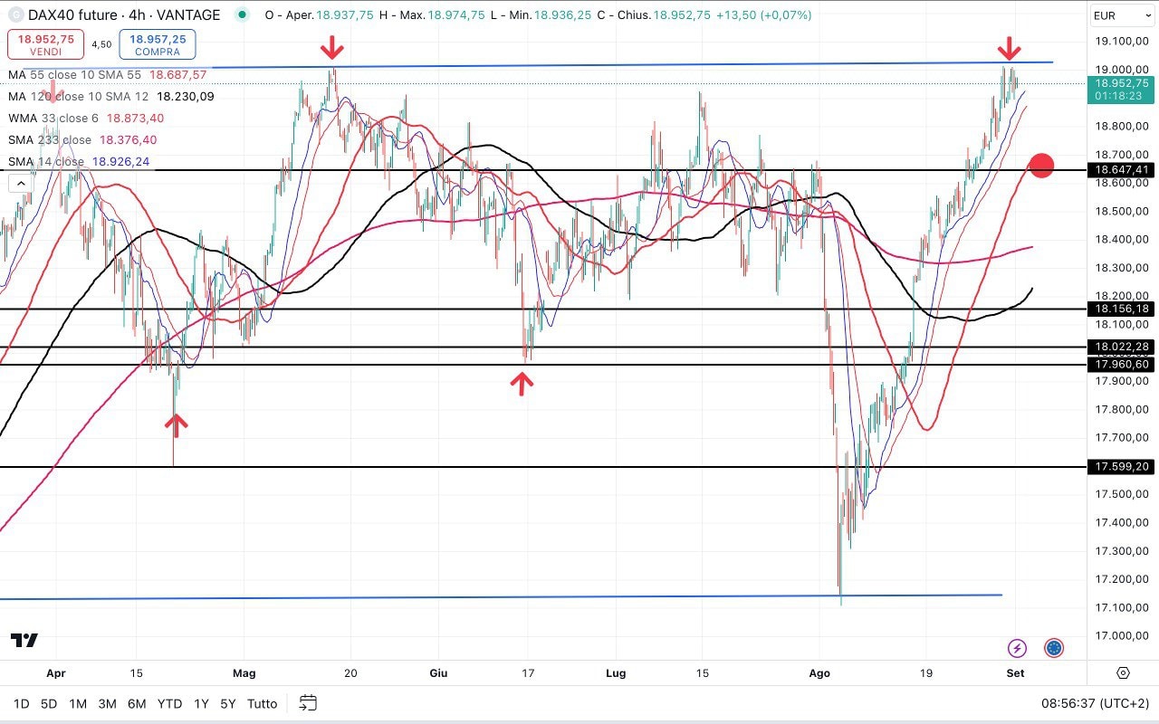 Sul DAX siamo arrivati ad un potenziale DOPPIO MASSIMO poco sopra i 19000 punti (il precedente massimo si era verificato a metà Maggio).