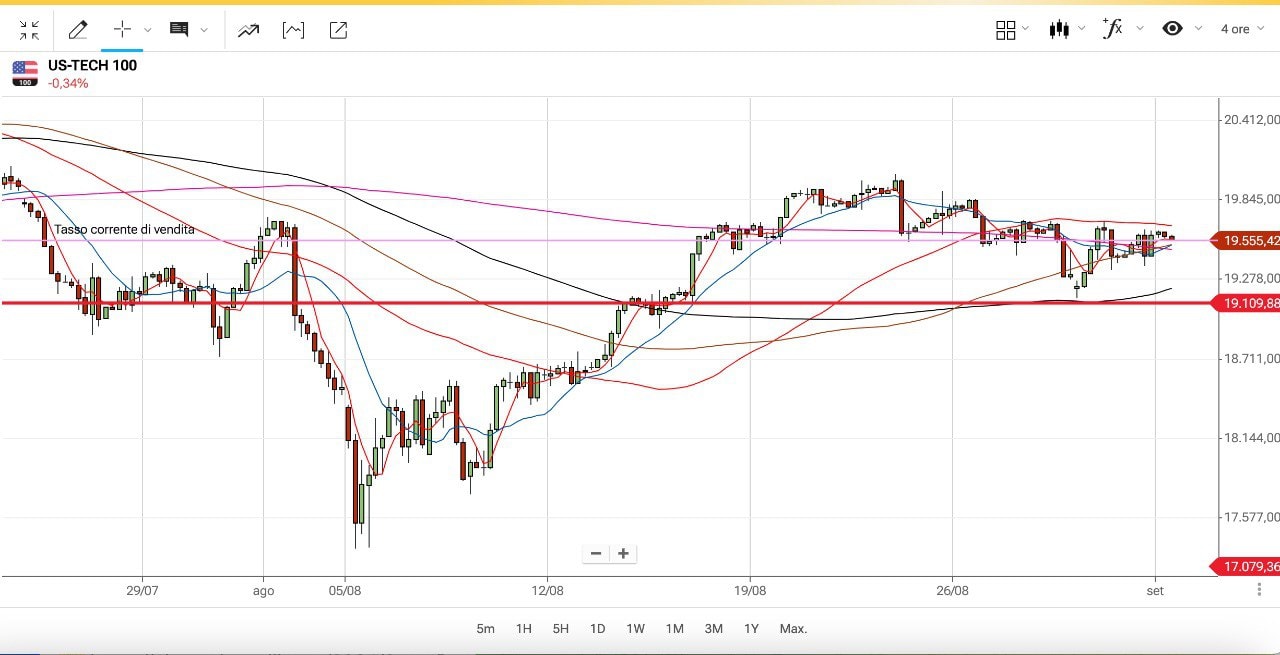 Il NASDAQ 100 aveva fatto un massimo il 22 Agosto a 20000 punti e si trova ora tra i 19500 e i 19600 punti ma è già arrivato la settimana scorsa a sfiorare la soglia dei 19000 punti.
