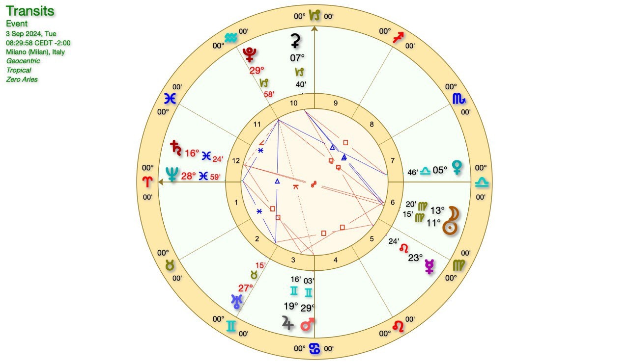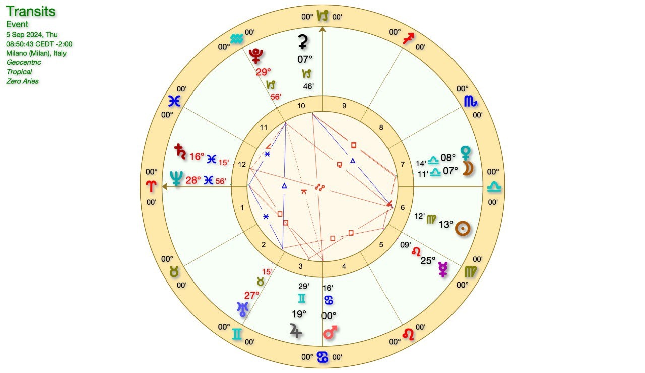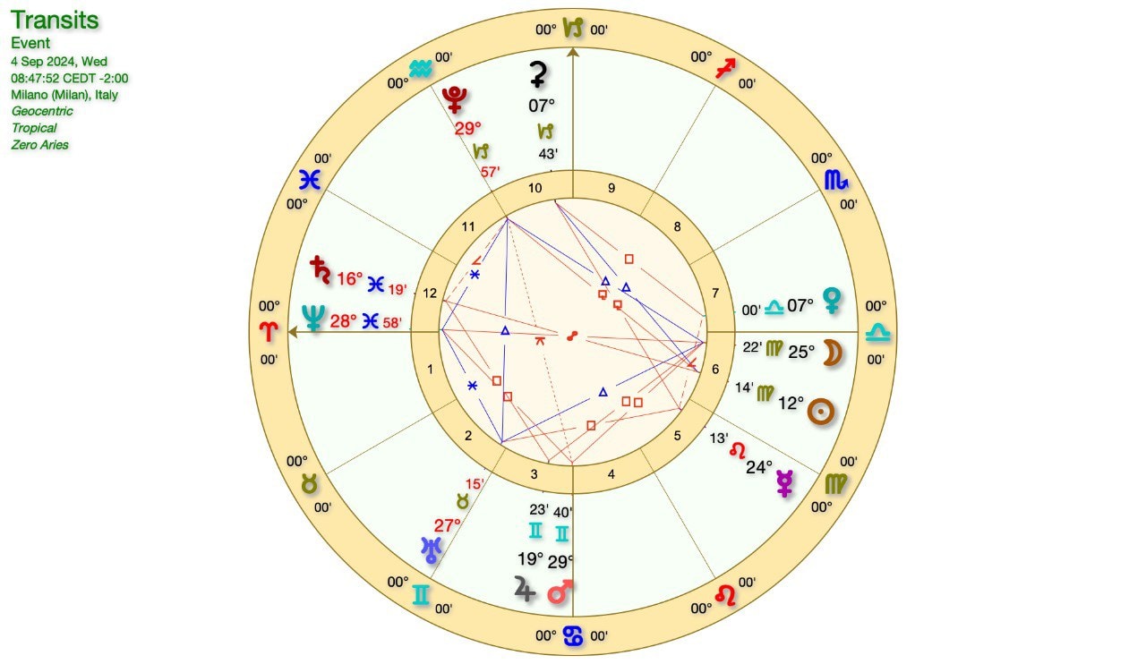 PLUTONE, come già riferito, è tornato temporaneamente in CAPRICORNO, mentre persiste la configurazione conflittuale delle QUADRATURE GIOVE-SATURNO / MARTE-NETTUNO / MERCURIO-URANO.