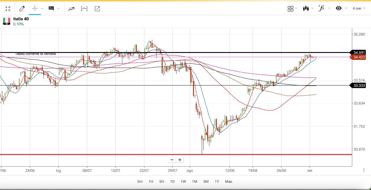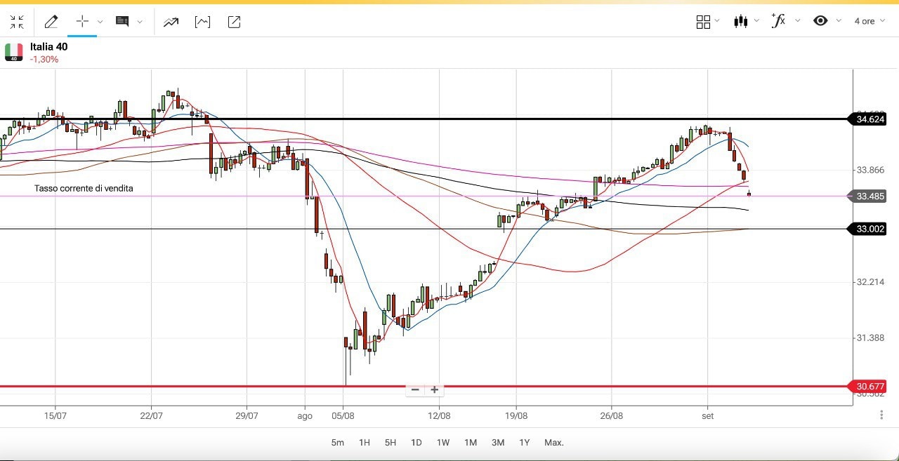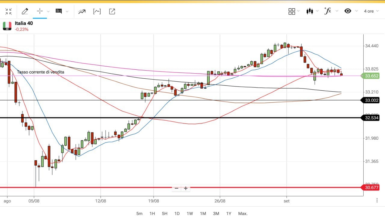 La discesa tanto attesa alla fine è arrivata, con il MIB che dai massimi di ieri a 34500 punti si trova ora a 33500 punti, vale a dire 1000 punti sotto.