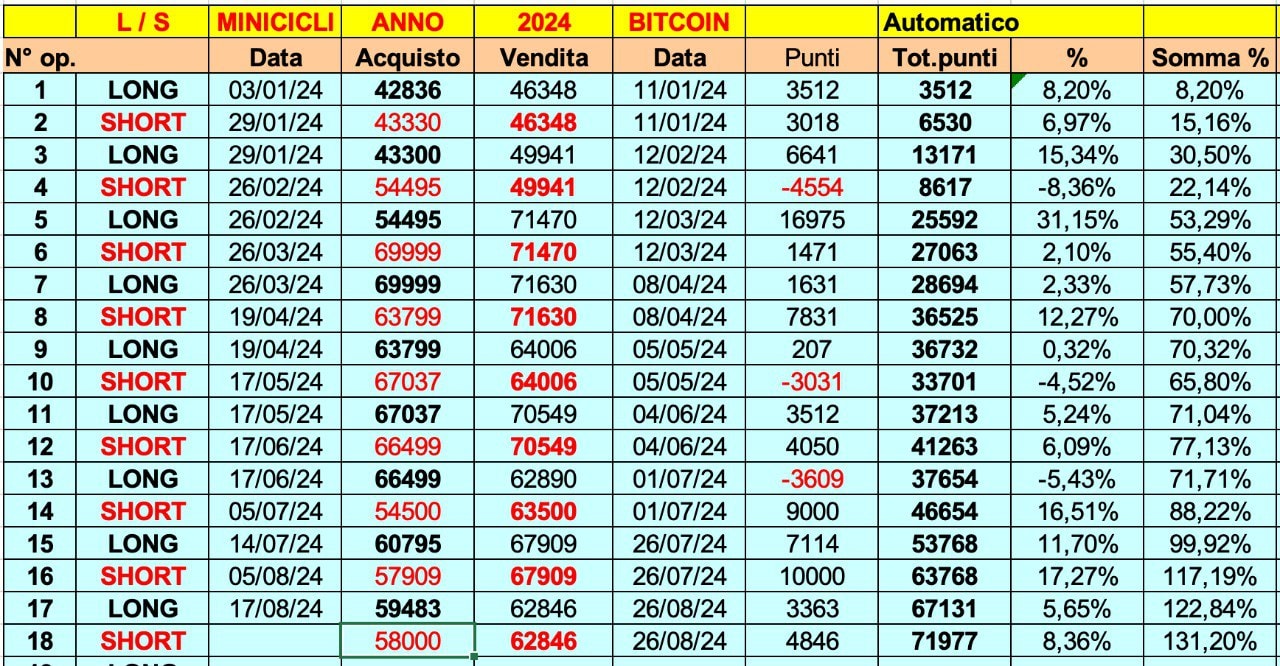 Conteggiando in ogni caso il risultato parziale abbiamo da 62600 a 58000 dollari = +4600 punti/ dollari su BITCOIN e da 2670 a 2470 = +200 punti dollari su ETHEREUM.