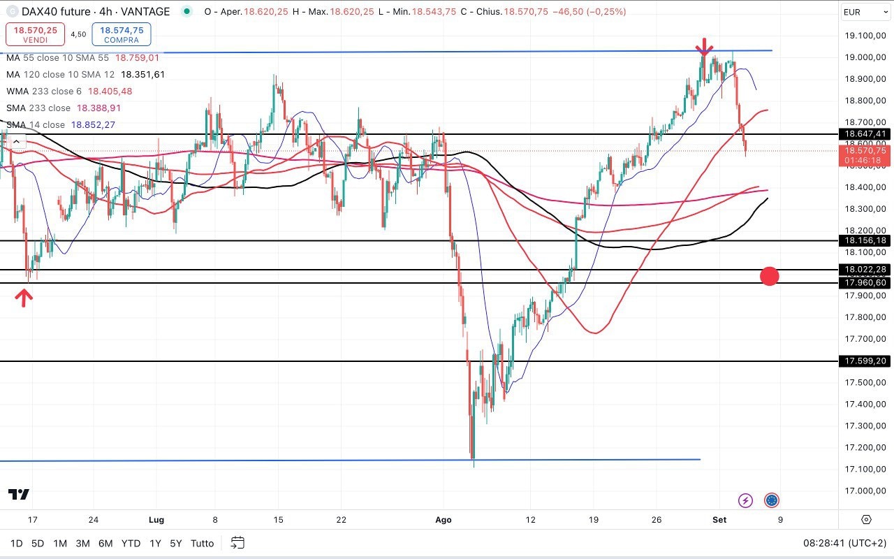 Il DAX future ha fatto un massimo poco sopra i 19000 punti, che in realtà è un DOPPO MASSIMO rispetto a quello di metà Maggio, mentre ora ci troviamo attorno ai 18600 punti, quindi siamo scesi di circa 300 punti.