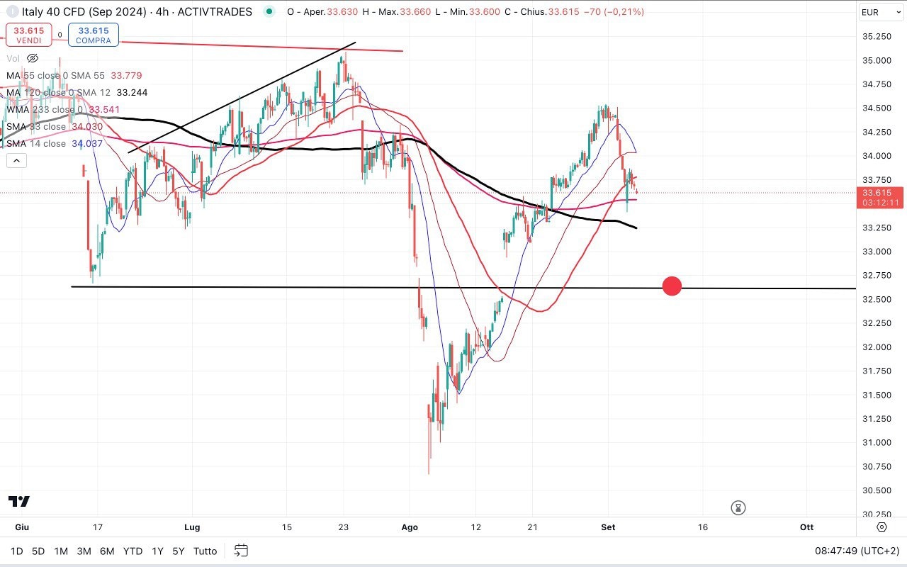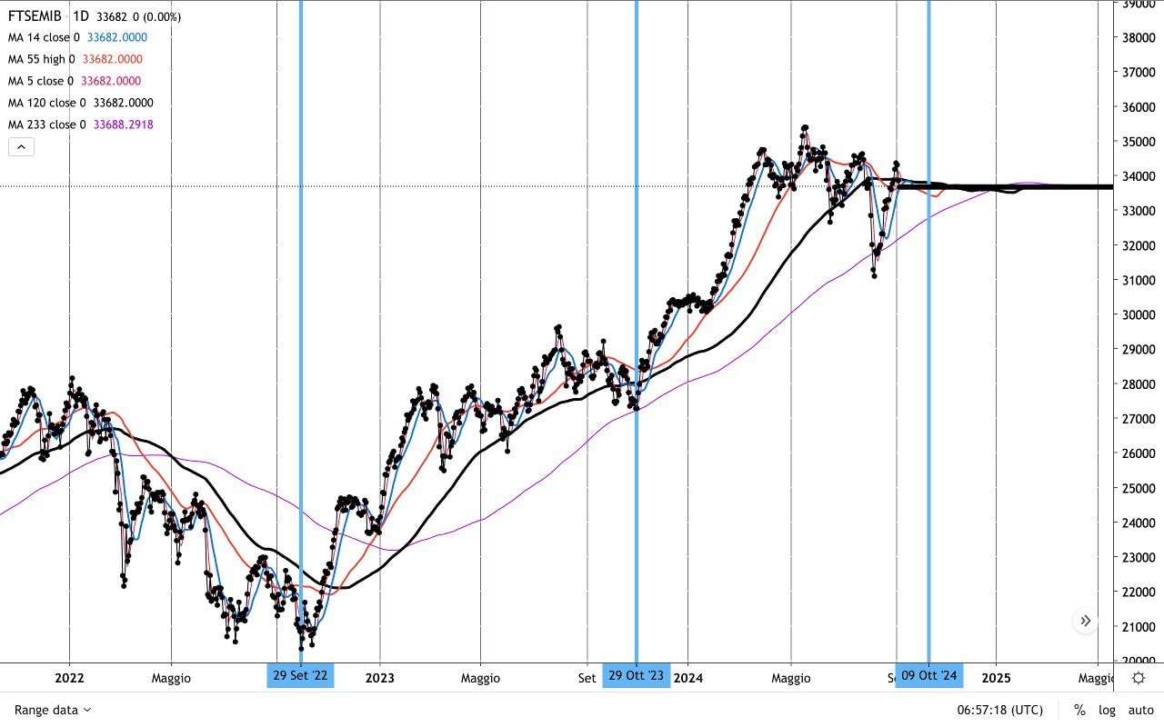 Tecnicamente il MIB si trova sotto la MEDIA MOBILE a 55 e sta testando la 233, quindi se riesce a bucarla può accelerare verso il basso….