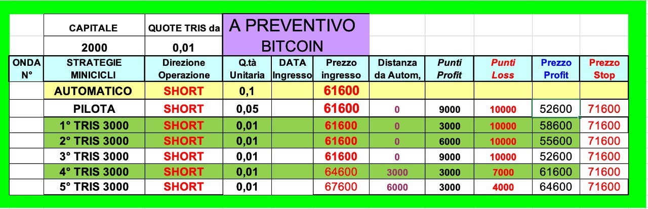 Dai 61600 iniziali era scattato il take profit della QUARTA QUOTA, da 64600 a 61600 (+3000), poi la PRIMA QUOTA da 61600 a 58600 (+3000) e infine la SECONDA QUOTA da 61600 a 55600 (+6000).