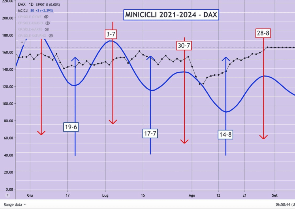 E’ possibile dunque ipotizzare un MINIMO tra la fine di Settembre e l’inizio di Ottobre ma visto che ora i mercati sono ancora vicino ai massimi assoluti bisognerà seguire l’evoluzione giorno per giorno.
