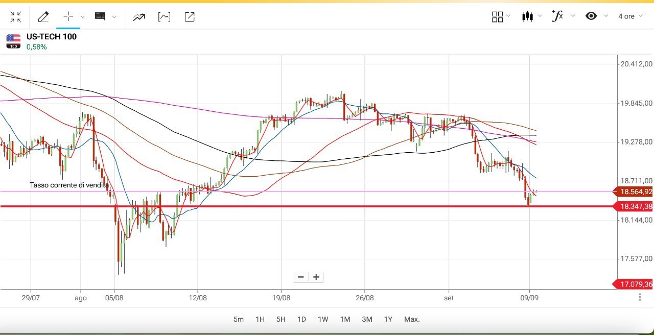 Nella giornata di Venerdì 6 Settembre abbiamo assistito ad un ulteriore affondo ribassista, molto marcato sul NASDAQ 100, arrivato fino ai 18350 punti circa.