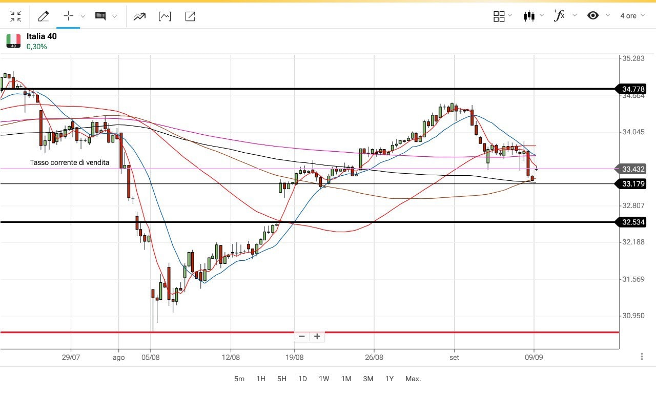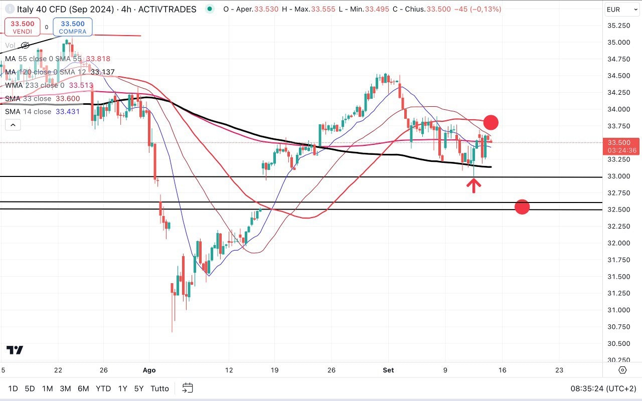 Con la discesa di Venerdì attorno ai 33200-33250 punti, il MIB potrebbe aver trovato un temporaneo SUPPORTO, in corrispondenza della MEDIA MOBILE nera a 120 periodi.