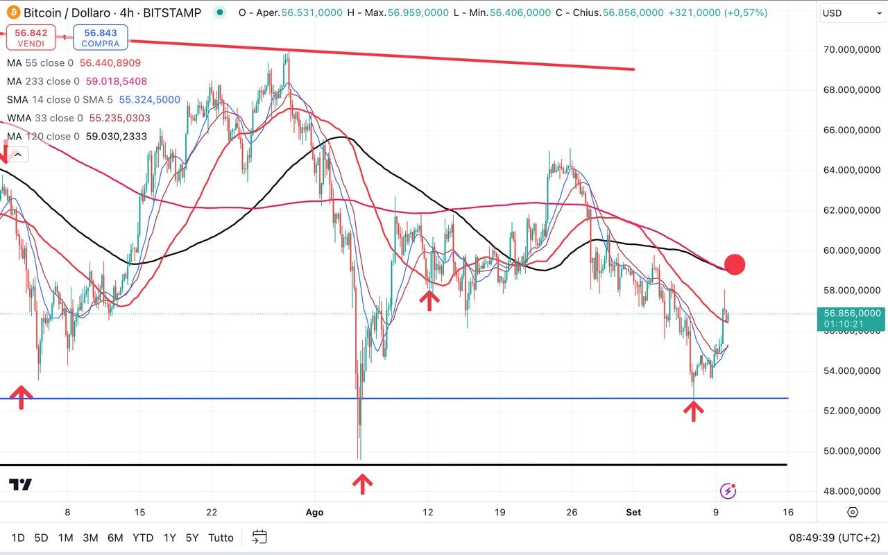 Qui l’obiettivo rialzista di breve potrebbe trovarsi verso i 59000 dollari, dove si intravede una prima importante RESISTENZA.