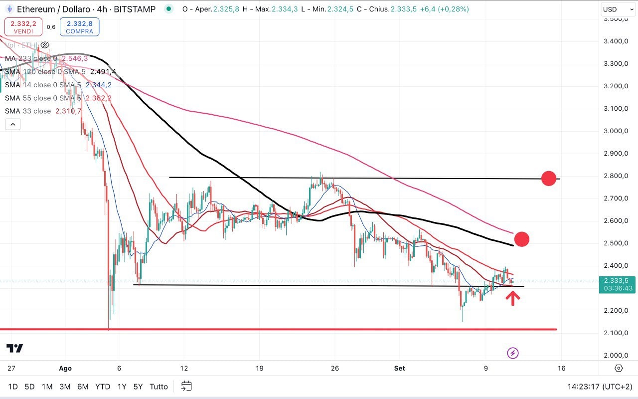 Con la seduta del 6 Settembre (mentre eravamo all’interno dell’ONDA al RIBASSO dei MINICICLI), ETHEREUM ha fatto una sorta di DOPPIO MINIMO poco sopra i 2100 dollari con quello del 5 Agosto.