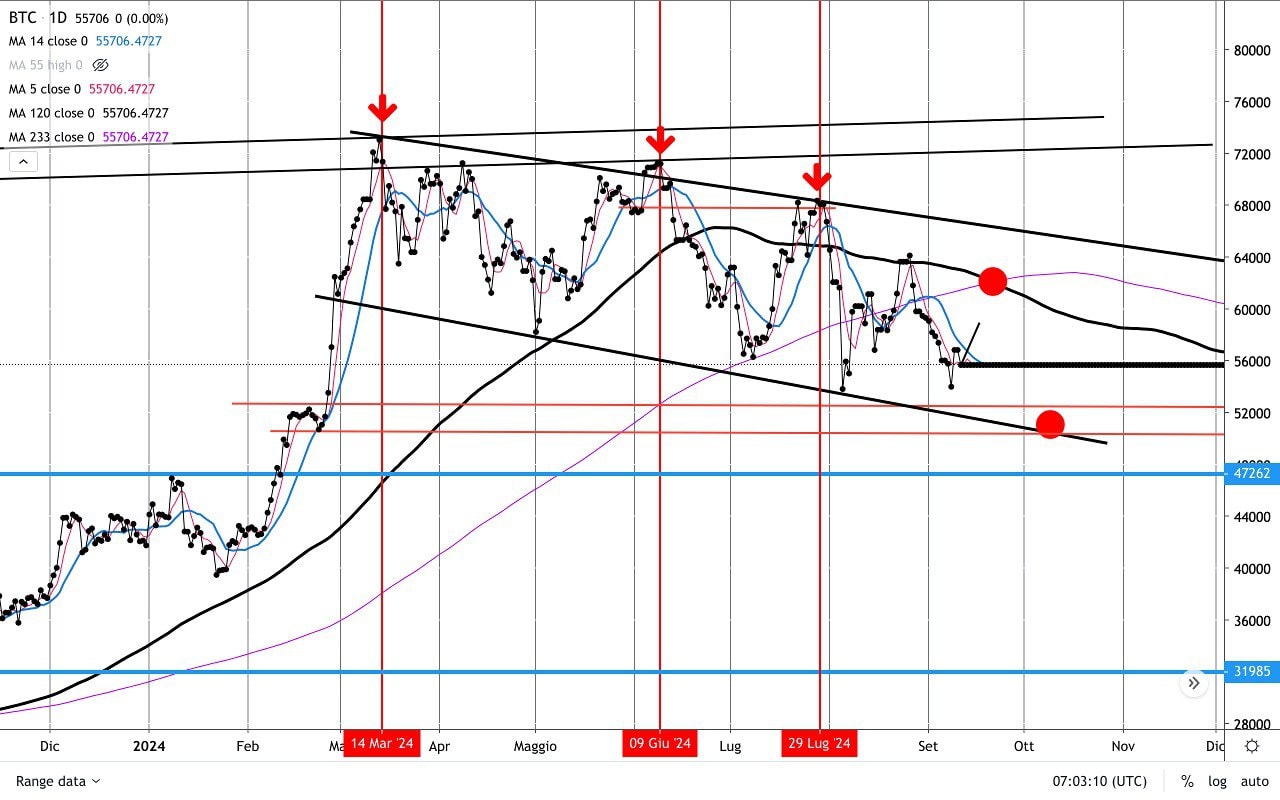 Qualora venissero superati i 59000 dollari si potrebbe arrivare attorno ai 62000 dollari e da lì riprendere la direzione ribassista, con obiettivo nuovamente a 52000 dollari o anche sotto.