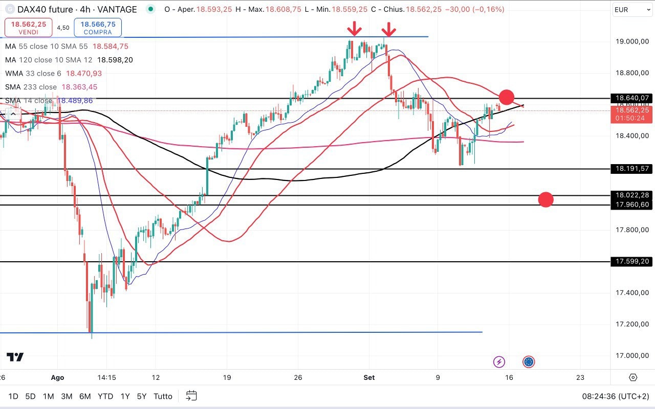Il DAX è salito dai 18200 punti ai 18600-18650 punti, raggiungendo la MEDIA MOBILE a 55 periodi.