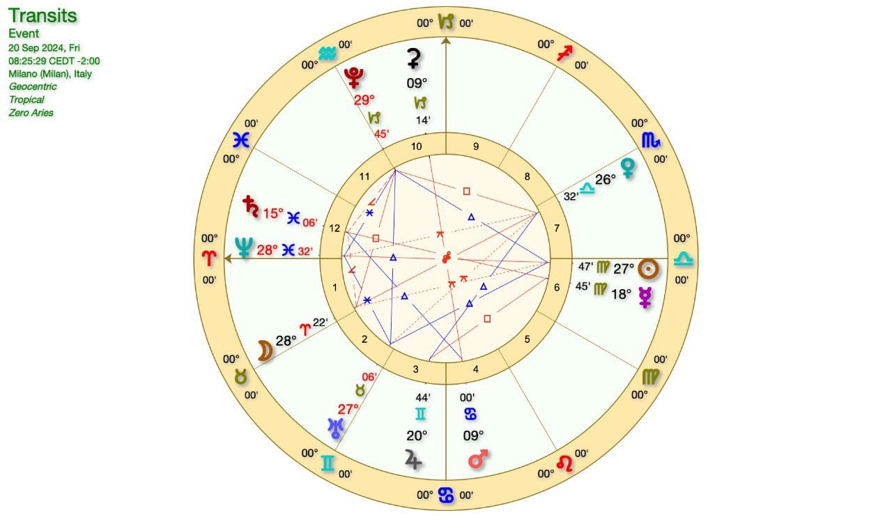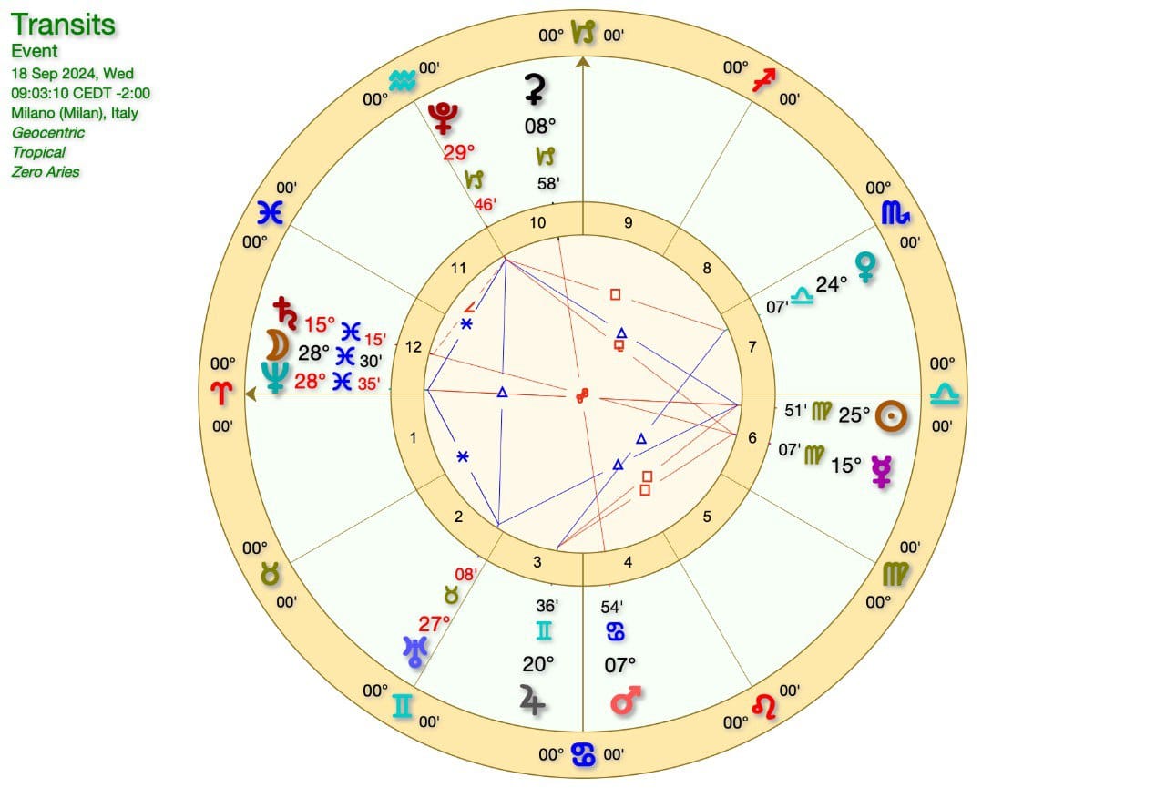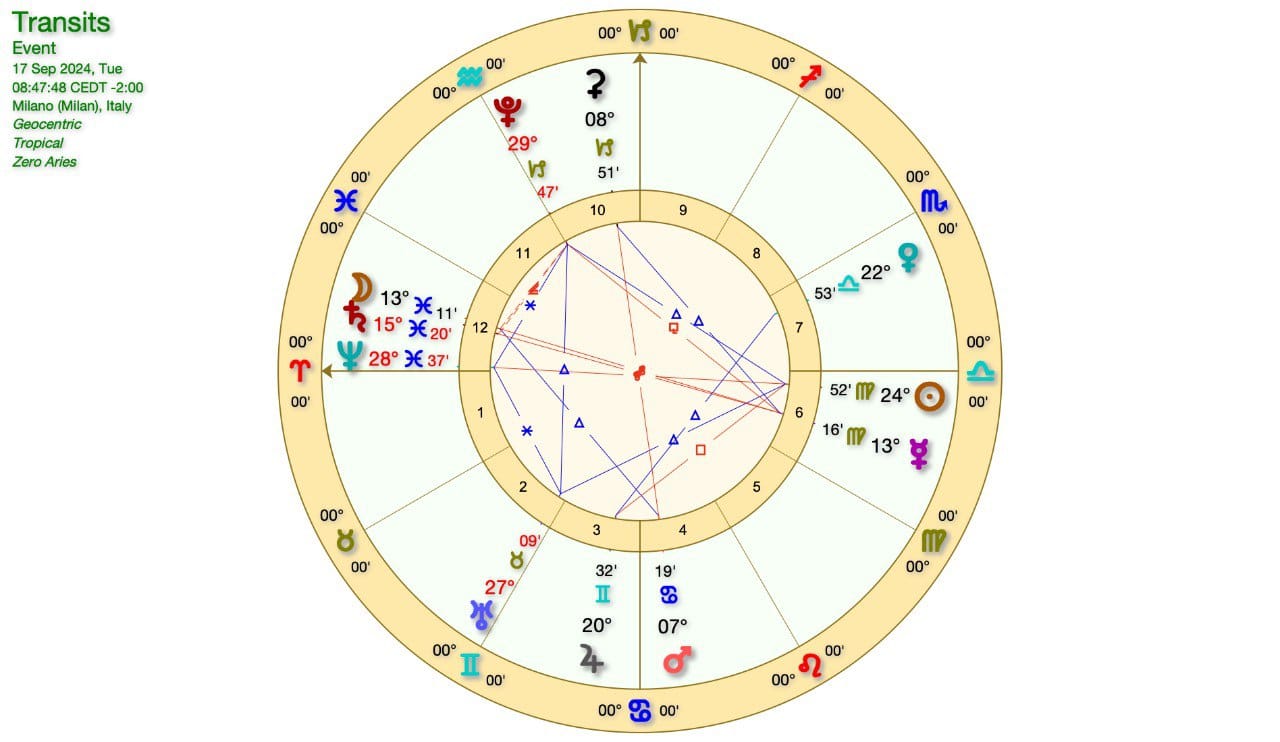 SOLE in VERGINE in OPPOSIZIONE alla CONGIUNZIONE LUNA-NETTUNO in PESCI, mentre abbiamo in corso una QUADRATURA SOLE-GIOVE e GIOVE-NETTUNO.