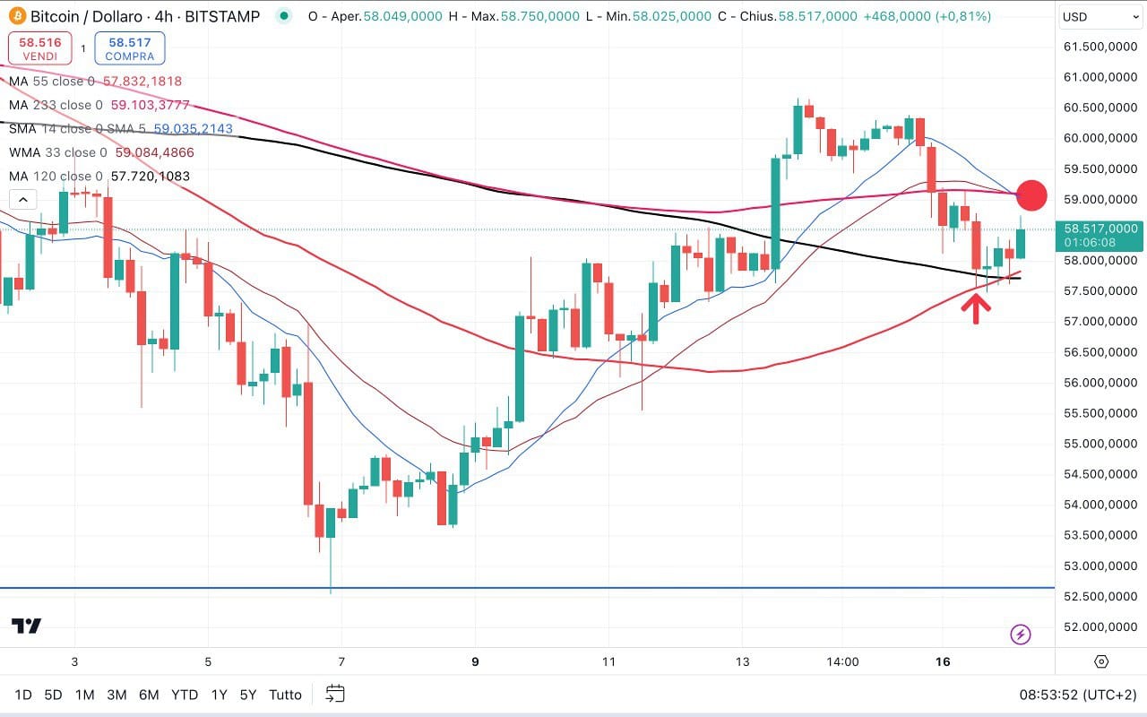 In effetti, come ipotizzavo ieri, il BITCOIN ha trovato un SUPPORTO ed ha poi rimbalzato sfiorando i 59000 dollari, che era l’obiettivo di breve in caso di rimbalzo.