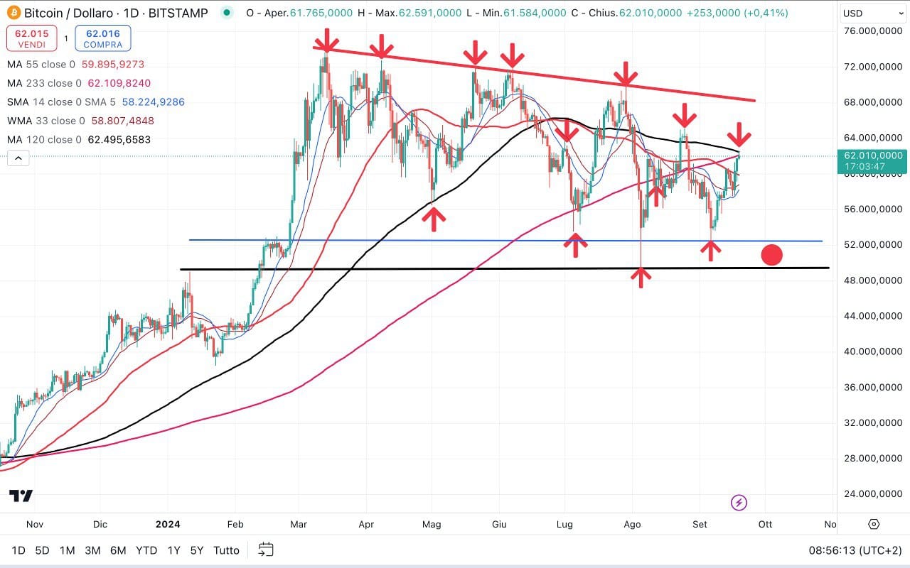 Vediamo dunque il BITCOIN, questa mattina proprio sulla soglia dei 62000 dollari.