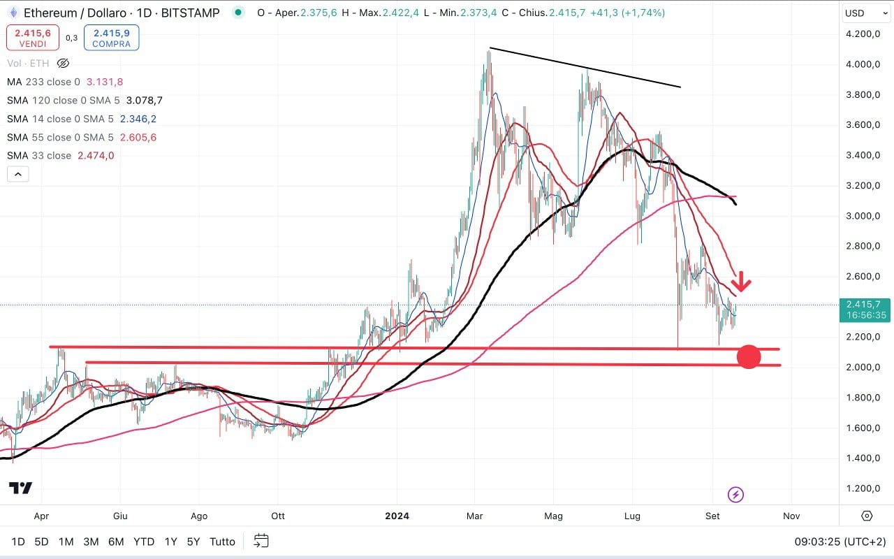 Uno sguardo anche a ETHEREUM, che appare più debole di BITCOIN.