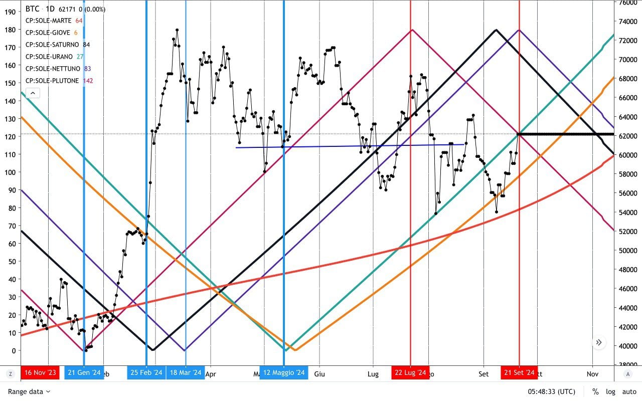 Sulla OPPOSIZIONE di Luglio tra SOLE e PLUTONE effettivamente vi fu un MASSIMO e una discesa mentre sulla successiva tra SOLE e SATURNO il BITCOIN si trovava su un MINIMO, da cui è poi ripartito.
