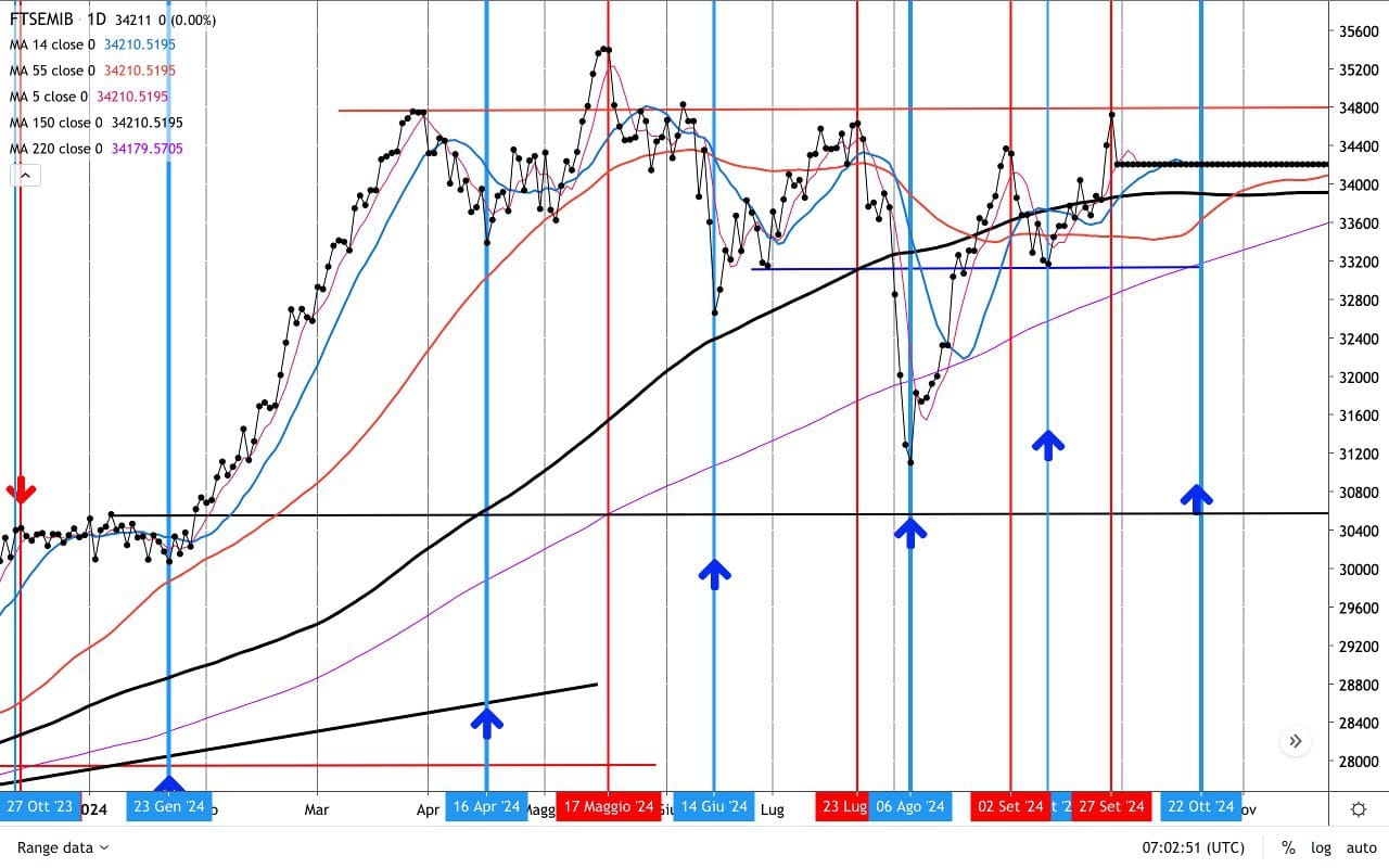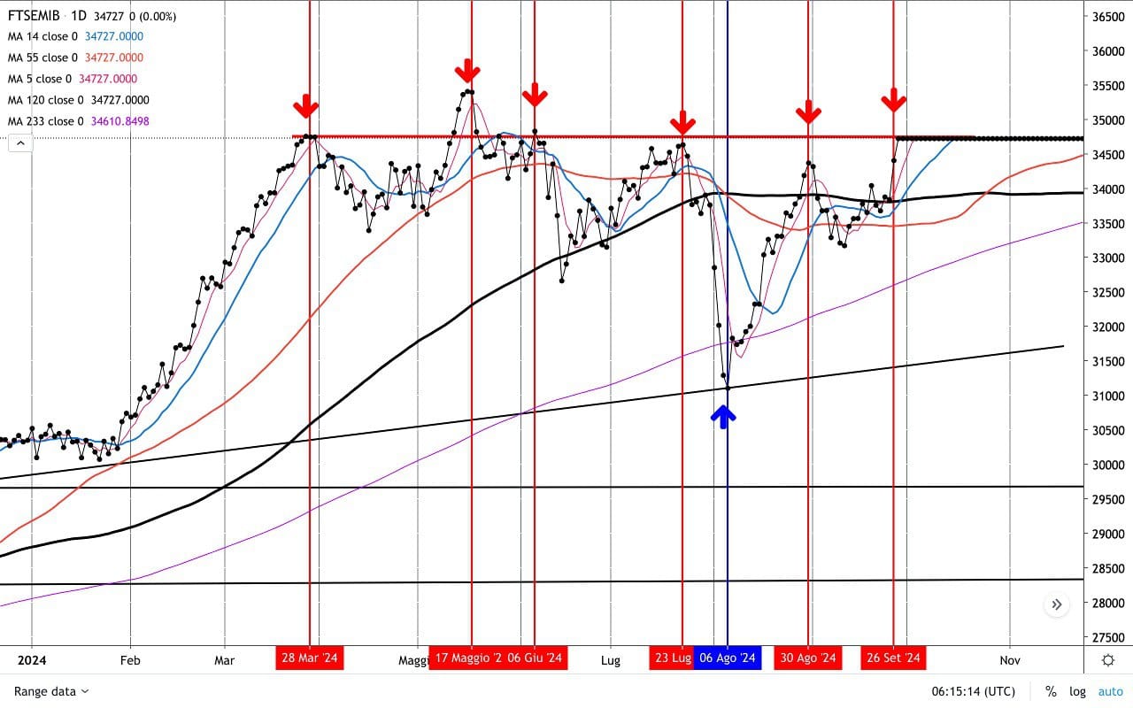 Osserviamo la RETTA orizzontale rossa allineata ai MASSIMI più importanti dell’anno, in particolare quelli di fine Marzo e fine Luglio, che precedettero delle discese, fatti attorno ai 34700 punti di Ftse Mib.