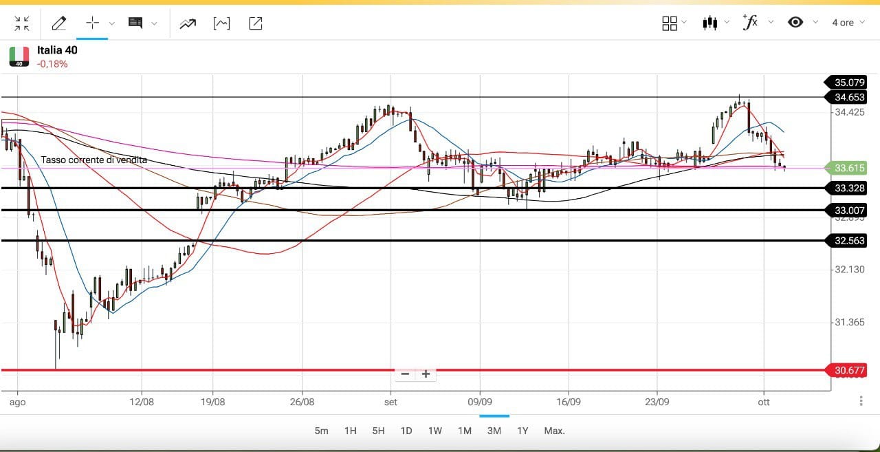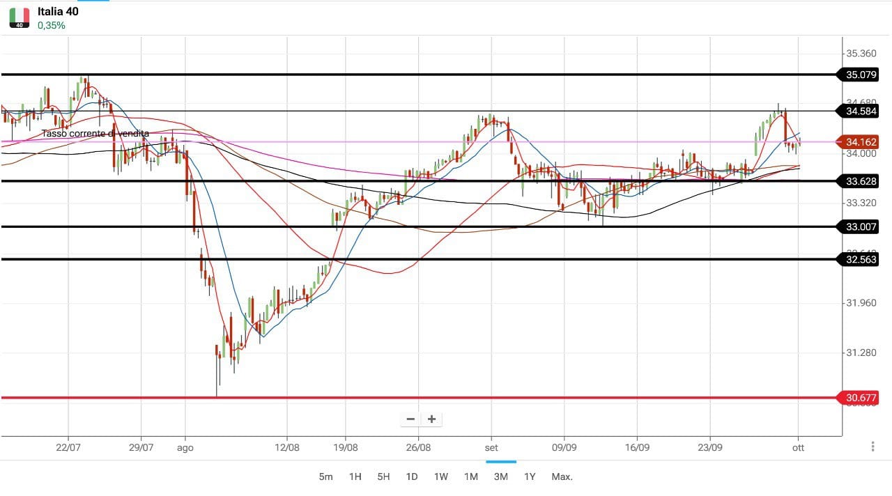 Ieri dunque il MIB è tornato sulla soglia dei 34000 dopo aver sfiorato i 34700 punti nella seduta di Venerdì 27 Settembre, mentre ora siamo attorno ai 34150-34200 punti.