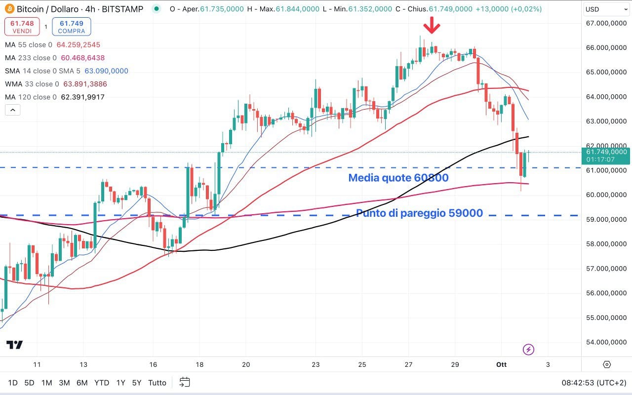 Il grafico dà la possibilità che si possa tornare verso i 62000-62500 dollari ma qualora venissero bucati i 60000 dollari si potrebbe scendere nuovamente verso obiettivi più bassi.