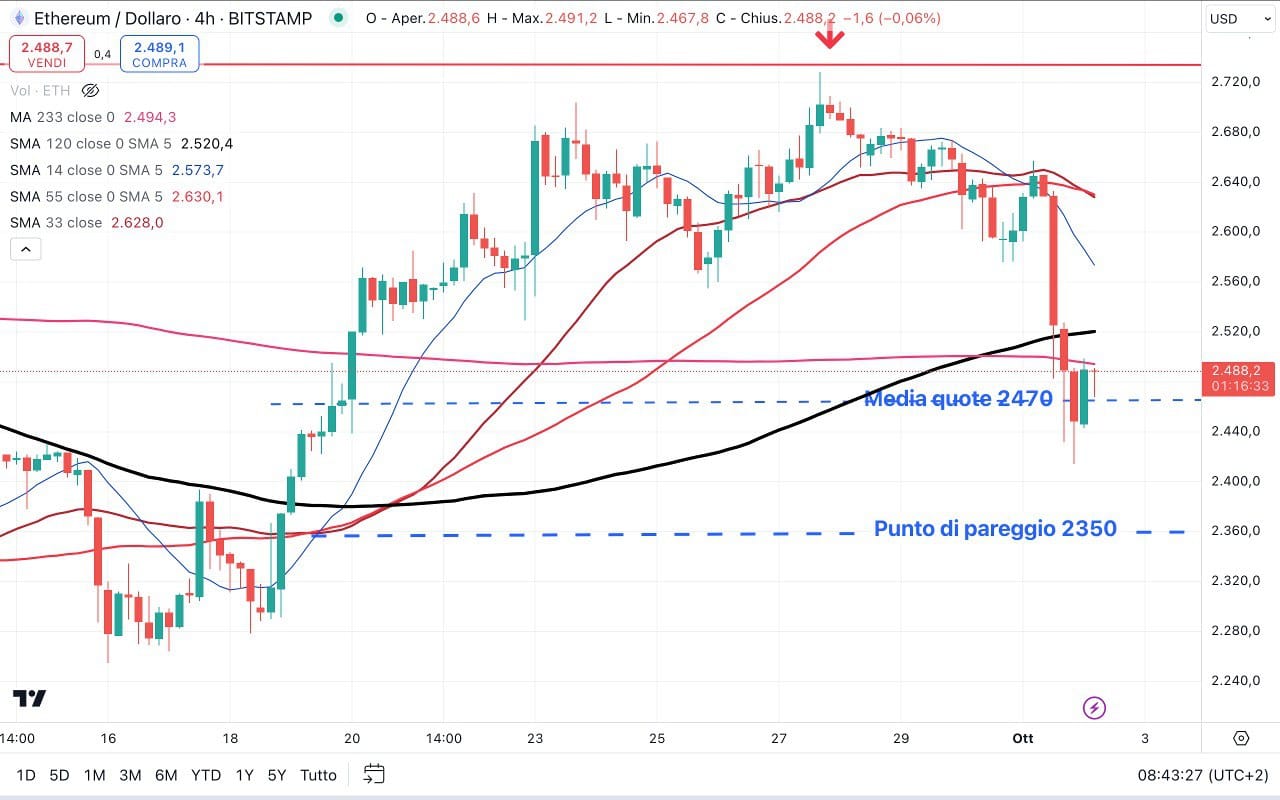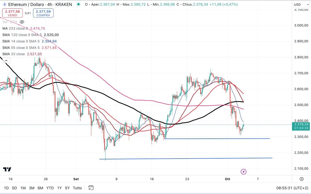 ETHEREUM sembra aver trovato un supporto di breve attorno ai 2300 dollari (dove eravamo ieri pomeriggio), da cui sta tentando un rimbalzo.