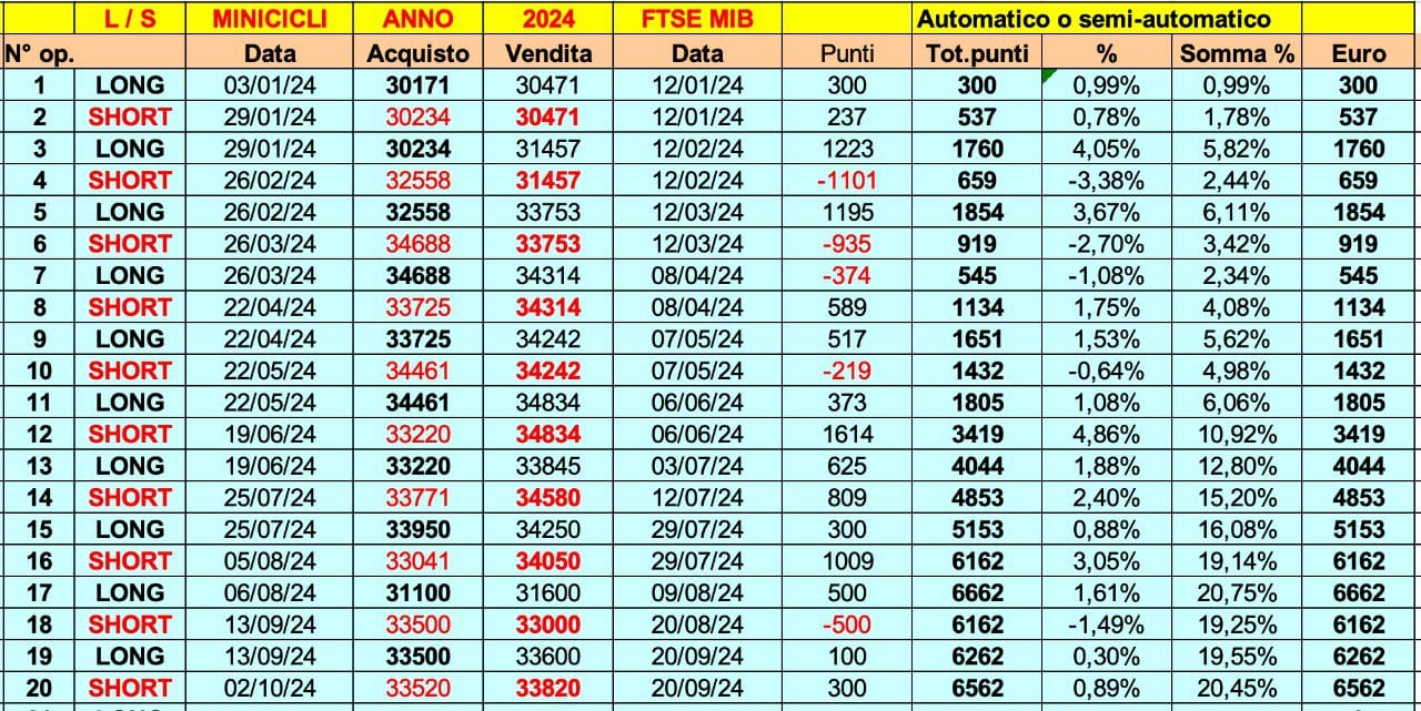 Sarebbe complicato riportare il conteggio delle singole QUOTE delle STRATEGIE sul MIB o su altri mercati, per cui cerco di semplificare il risultato complessivo con un SOLO DATO per ONDA dei MINICICLI.