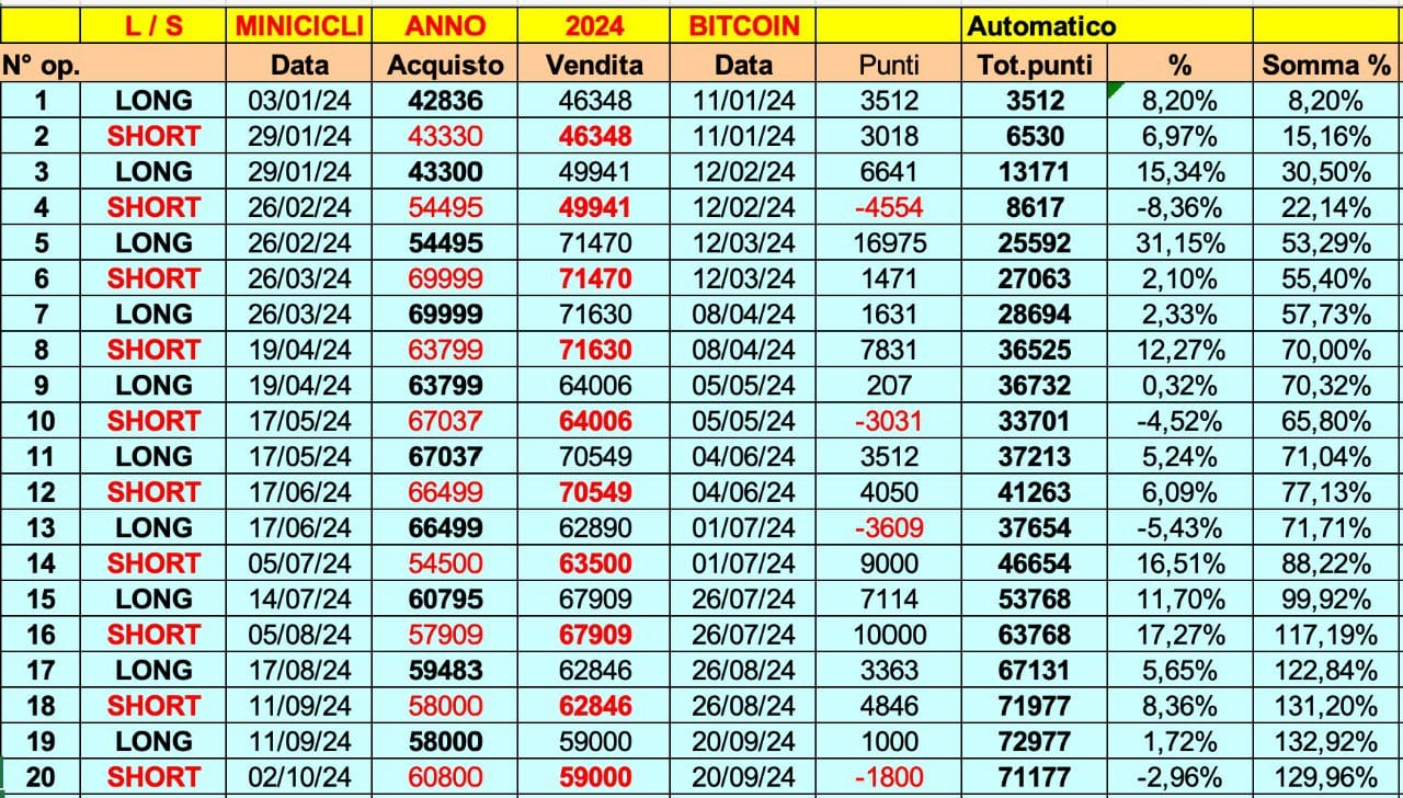 Aggiorno i RISULTATI MINICICLI 2024 su BITCOIN.