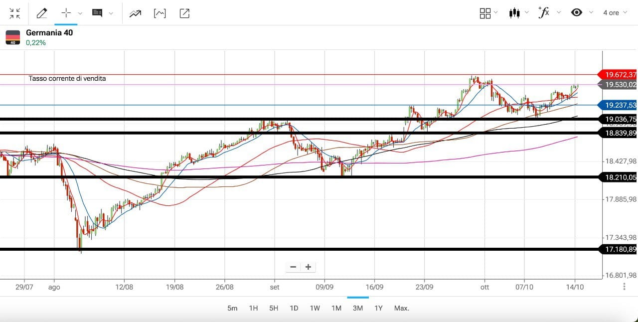 Anche il DAX ha assecondato l’ONDA al RIALZO dei MINICICLI dopo aver testato la soglia dei 19000-19100 punti che avevamo individuato la settimana scorsa, per poi ripartire con forza verso gli attuali 19500-19550 punti.