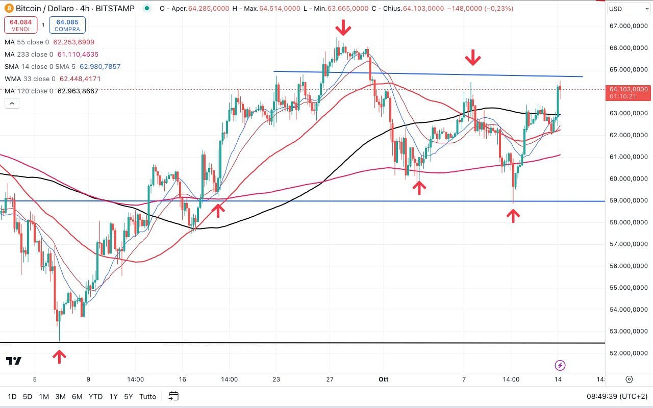 Anche le CRIPTOVALUTE stanno assecondando l’ONDA al RIALZO dei MINICICLI, con una forte accelerazione proprio nel fine settimana ed il BITCOIN che è tornato a 64000 dollari.