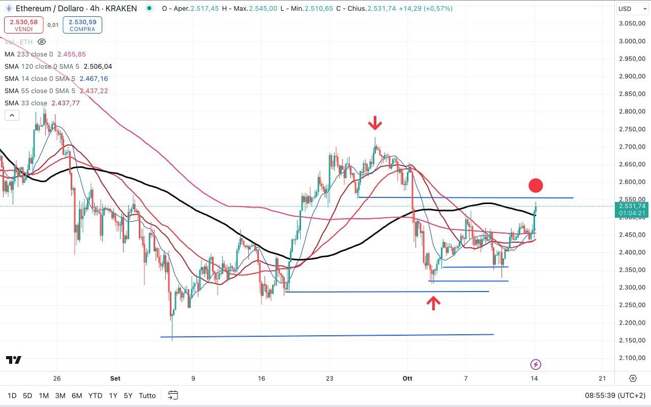 ETHEREUM ovviamente è salito assieme al BITCOIN arrivando vicino ai 2550 dollari.