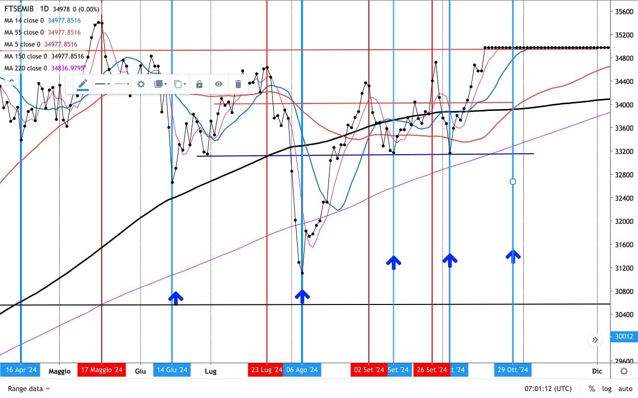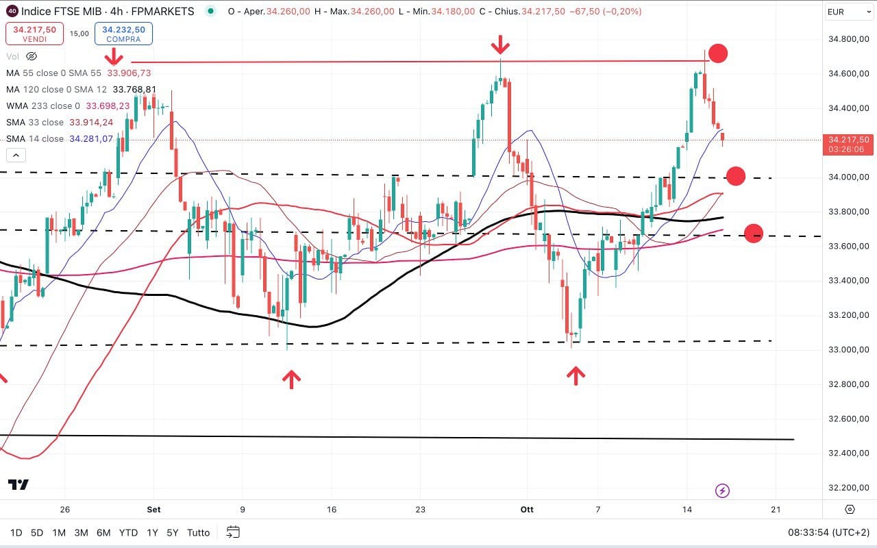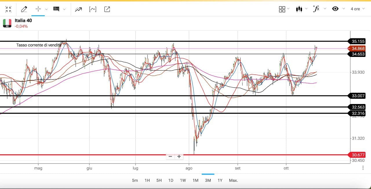 Il FTSE MIB è salito dai 33000 del 3-4 Ottobre agli attuali 34200 punti, come vediamo nel grafico sotto.
