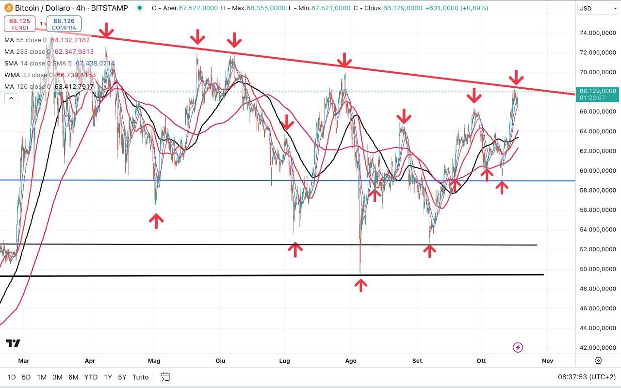 Un’occhata a BITCOIN, che ieri ha toccato pienamente i 68000 dollari, sulla TRENDLINE laterale discendente già esaminata.