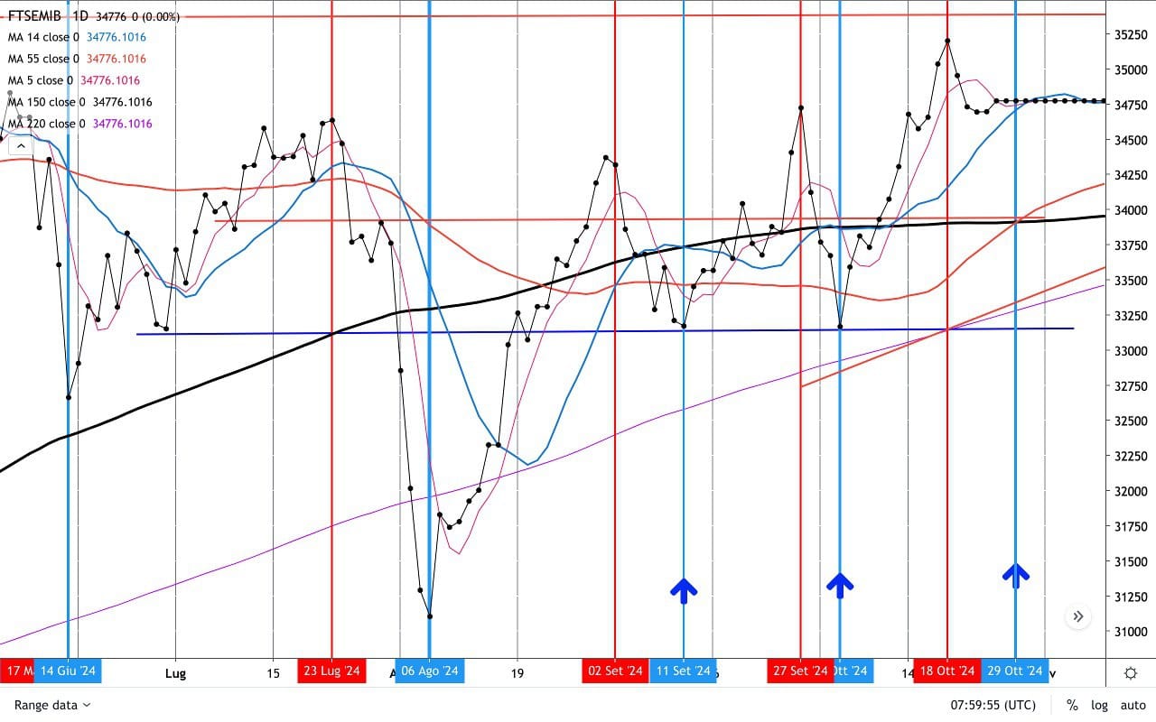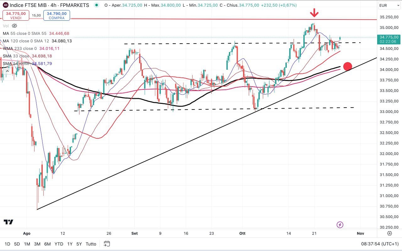 Il MIB era sceso nei giorni scorsi fino ai 34300-34400 punti, la dove la MEDIA MOBILE rossa a 55 periodi ha funzionato appunto da SUPPORTO.