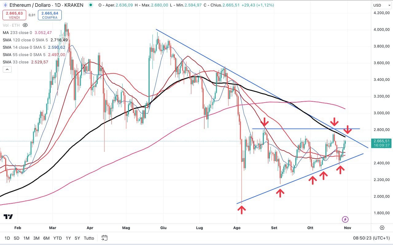 Una cosa simile per il BITCOIN, che tra il 23 e il 26 Ottobre si era fermato sulla soglia dei 65000 dollari e in prossimità della MEDIA MOBILE nera a 120 periodi.