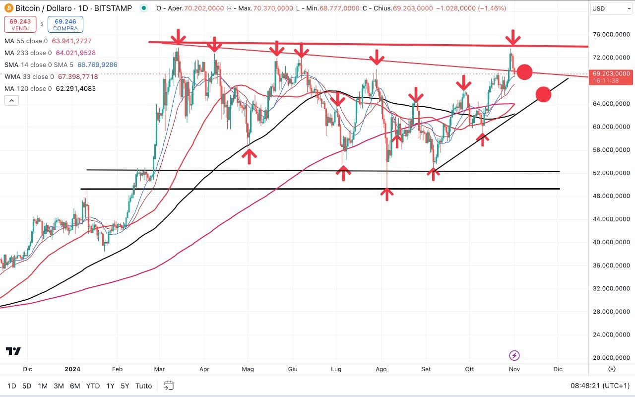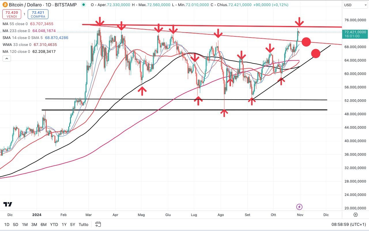 Qui siamo arrivati addirittura ad un temporaneo doppio massimo attorno ai 74000 dollari, mentre ora il prezzo è sceso a 72000 dollari.