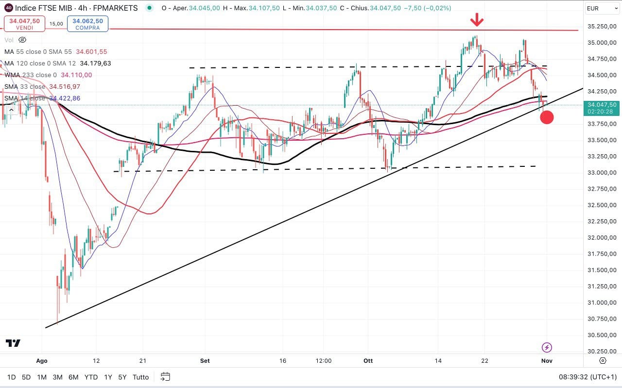 La prospettiva, che vediamo meglio nel grafico sotto, è sempre quella di un potenziale approdo verso i 34000-34100 punti , all’incrocio di alcune medie mobili e in prossimità della TRENDILINE rialzista partita a inizio Agosto.
