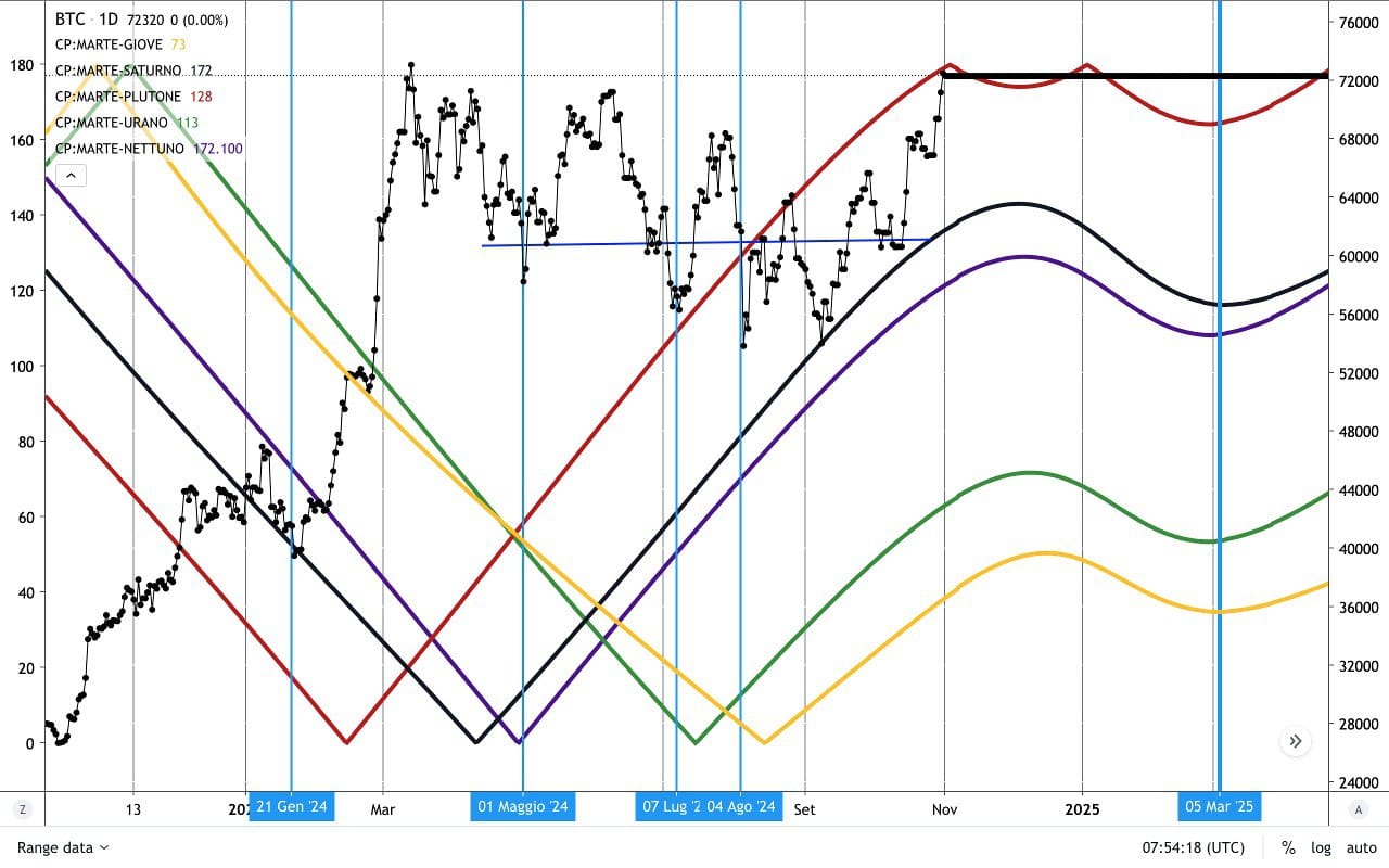 Notate ad esempio che il BITCOIN ha fatto un potenziale doppio massimo proprio sulla OPPOSIZIONE MARTE-PLUTONE (qui sopra nel grafico del GIAN TRADER), che è attiva in questi giorni.