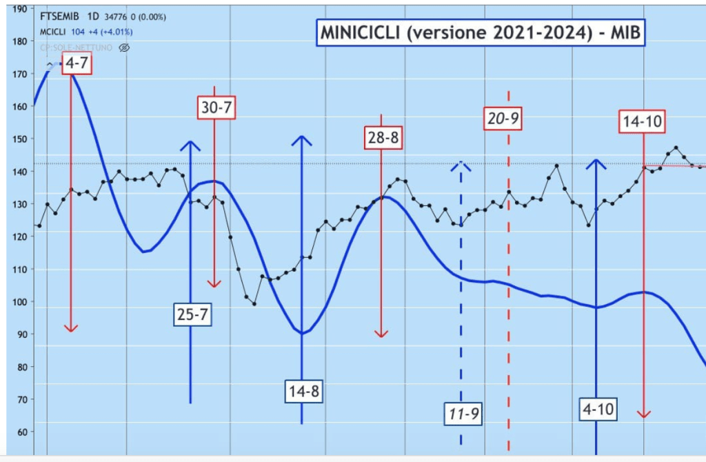 L’ANALISI TEMPORALE sul FTSE MIB ci mostra appunto la potenzialità di un MINIMO verso fine Ottobre – inizio Novembre, a distanza di tre mesi rispetto al MINIMO di AGOSTO.