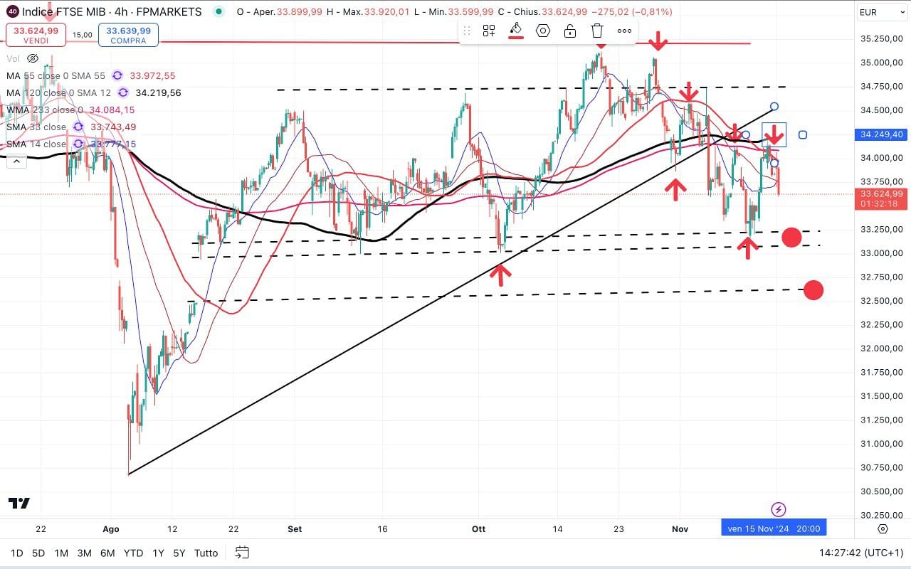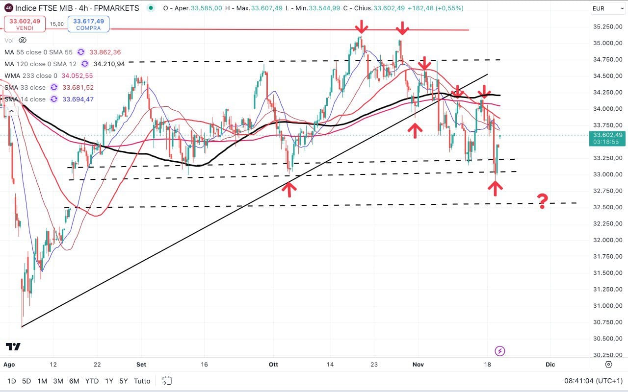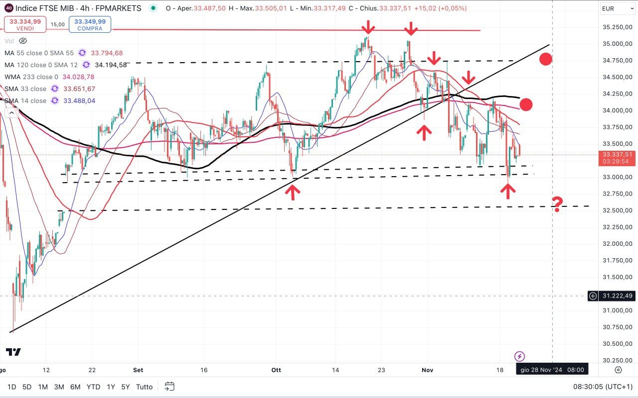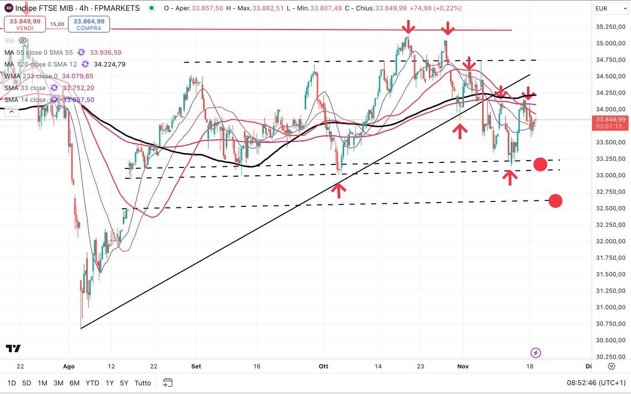 Tecnicamente, come analizzato, si è già verificato un rimbalzo dai 33200-33300 punti quindi ci troviamo circa a metà del range di 1000 punti compreso tra 33200 e 34200 punti.