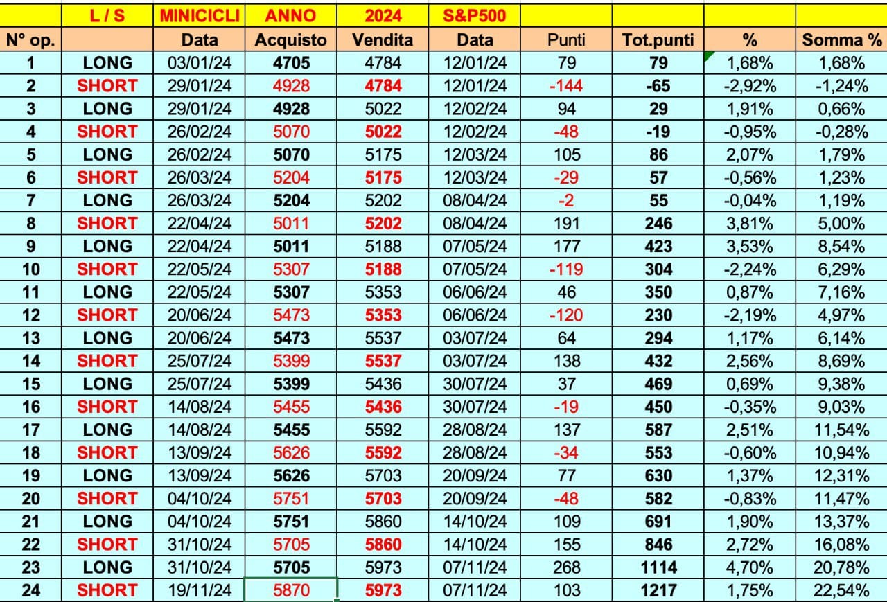 Per quanto questo si possa considerare un mercato abbastanza “ostico”, la correlazione con i MINICICLI è piuttosto buona, con un +30% e oltre +5700 punti.