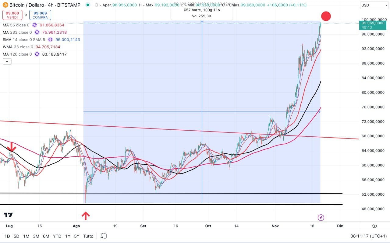 Il BITCOIN sta testando la soglia dei 99000 dollari e l’ha già superata di poco ma cerchiamo di capire perchè potrebbe essere vicino ad un PICCO MASSIMO.