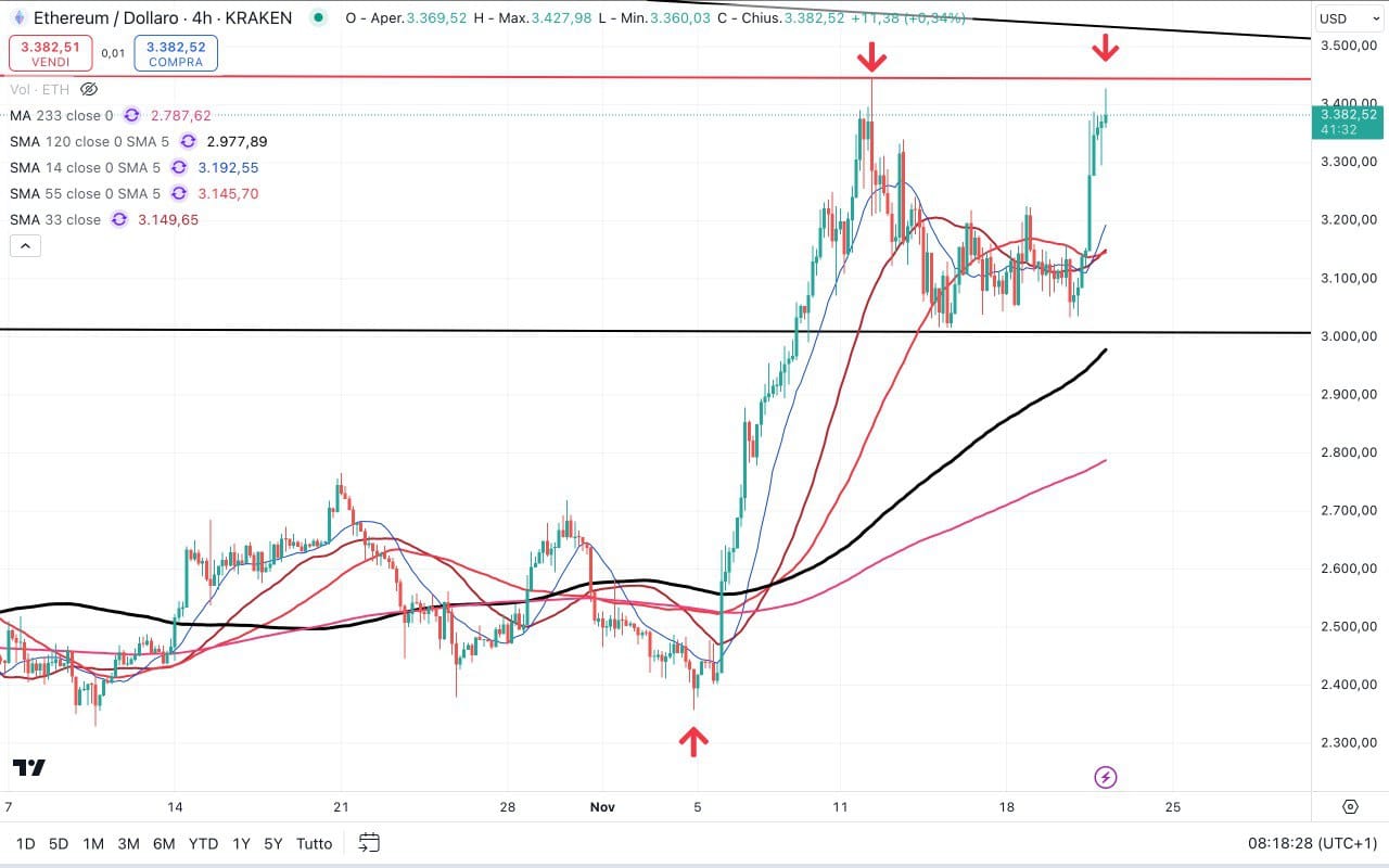 Diversa chiaramente la situazione su ETHEREUM, che sta facendo una sorta di doppio massimo di breve con quello del 12 Novembre attorno ai 3450 dollari.