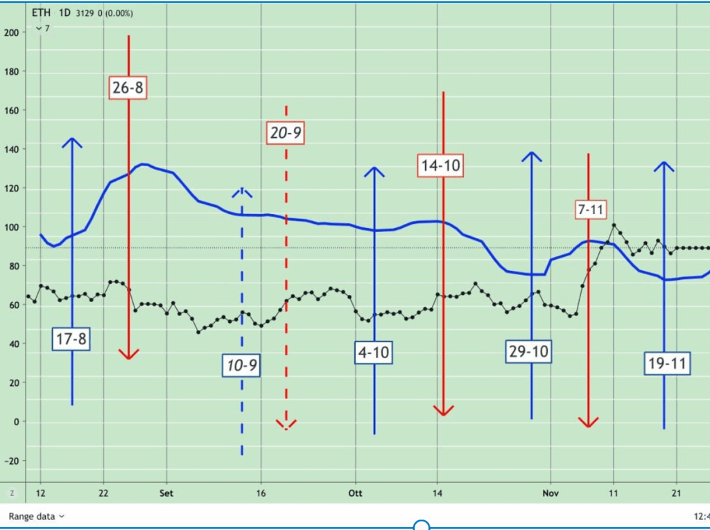 Riprendiamo il discorso di stamattina su ETHEREUM, che era rimasto all’incirca attorno ai 3100 dollari, vale a dire i valori del 19 Novembre (giorno di inversione da ribasso a rialzo per l’ONDA dei MINICICLI).