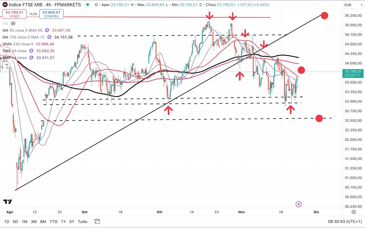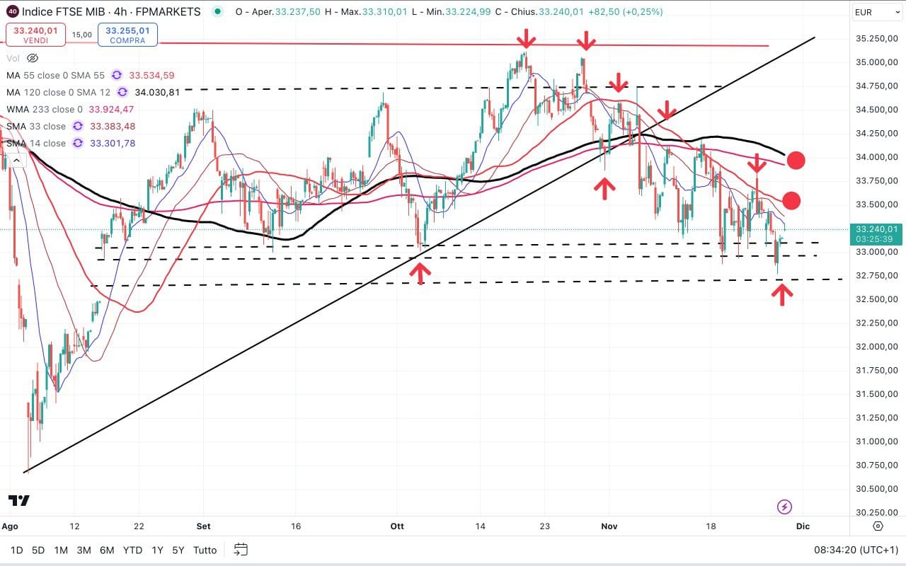 Nella giornata di ieri il MIB è salito fin sopra i 33400 punti mentre stamattina lo troviamo leggermente sotto i 33300 punti.