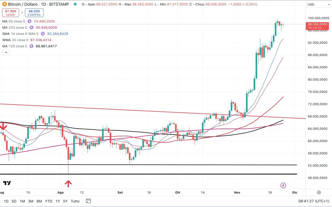 Vediamo innanzitutto che il TARGET individuato tra i 99000 e i 99500 dollari non è più stato superato!