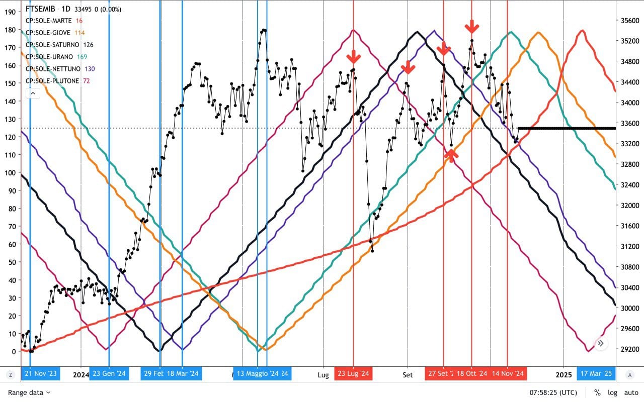 Notate ad esempio come l’ultimo massimo del FTSE MIB (14 Novembre) sia arrivato poco prima dell’OPPOSIZIONE al grado SOLE-URANO, oppure come il massimo del 18 Ottobre si sia trovato in coincidenza di un INCROCIO tra i CICLI di SOLE-MARTE (ascendente) e SOLE-PLUTONE (discendente).