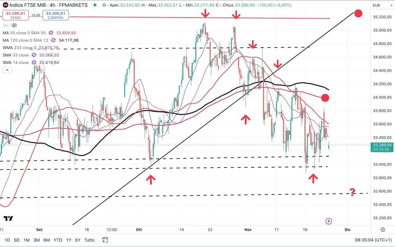 ll prezzo è infatti tornato sotto il livello di ingresso (che era 33350 punti), dando quindi la possibilità (eventualmente) di ricavalcare l’ONDA in senso rialzista (ora siamo attorno ai 33300 punti circa).