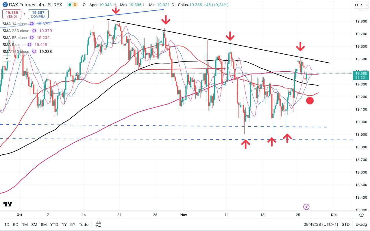 Il DAX in realtà sta tenendo meglio del MIB, essendo sceso di soli 100 punti rispetto al TAKE PROFIT di ieri a 19450 punti.