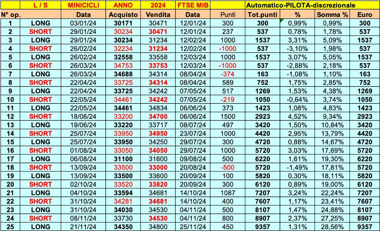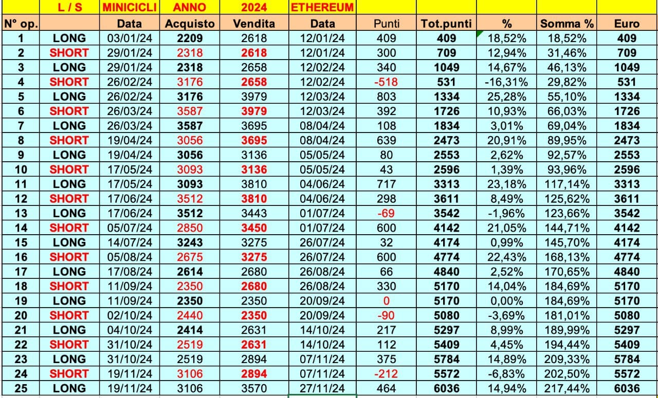 Ricordiamoci che l’anno 2024 sta per terminare con risultati fantastici dei MINICICLI su BITCOIN ed ETHEREUM, tali da essere valutati con grande attenzione.